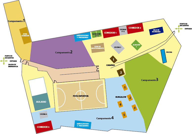 - Cabañas: Seis cabañas para alojamiento y pernocta, fabricadas en madera y con aislamiento de la lluvia y el frío. Puerta de acceso y ventana de ventilación. Capacidad para ocho personas cada una.